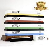 - ✅ SUPERIOR BUNDLE WITH CASE: Your complete knife sharpening kit comes with 4 double sided premium quality whetstones (240/800, 600/1500, 1000/3000 & 5000/10000), no slip Acacia Wood base for holding the stone, a flattening stone, knife sharpening angle guide and a form fit case